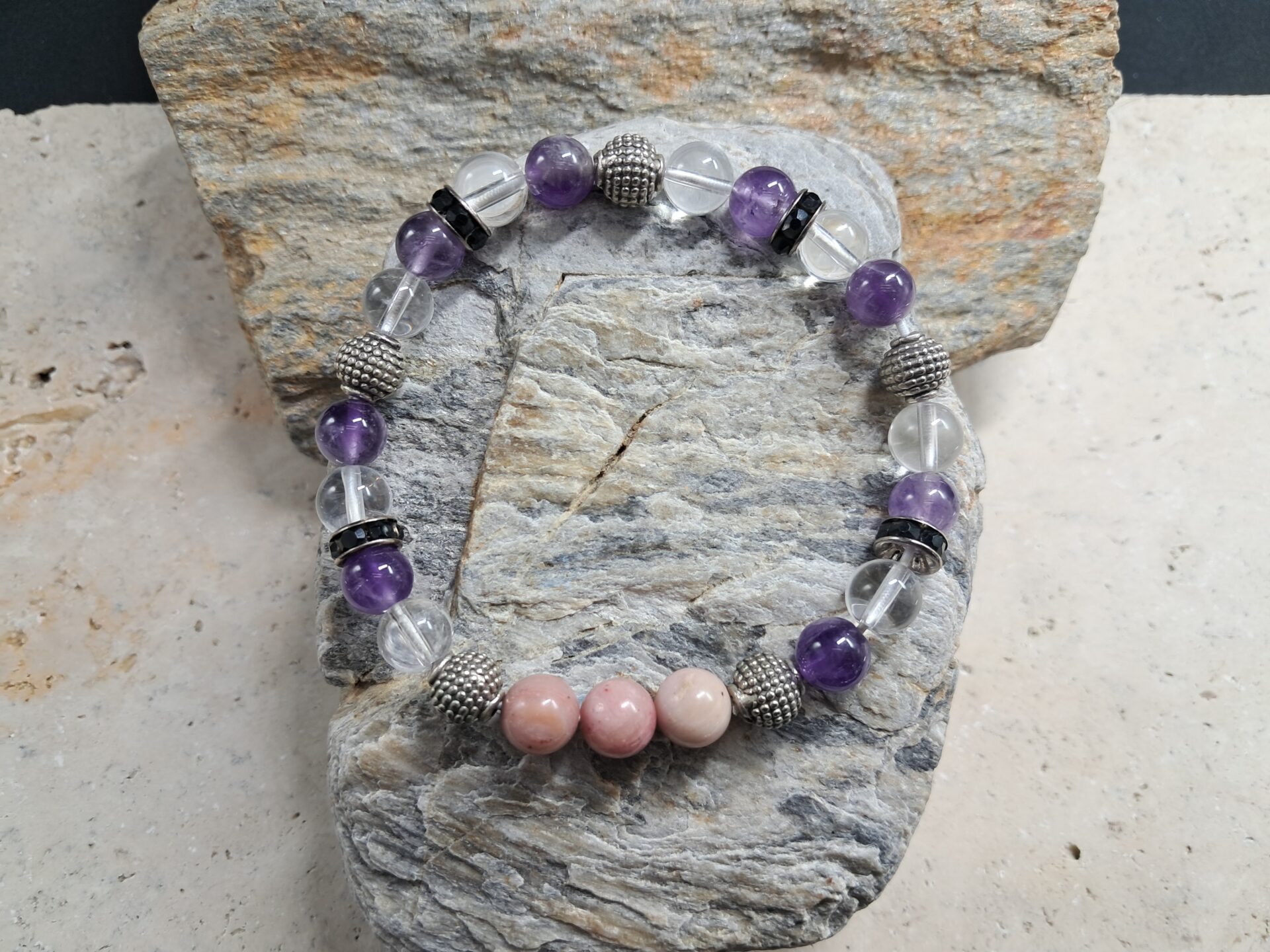 Bracelet améthyste, rhodonite, cristal de roche perles 8mm