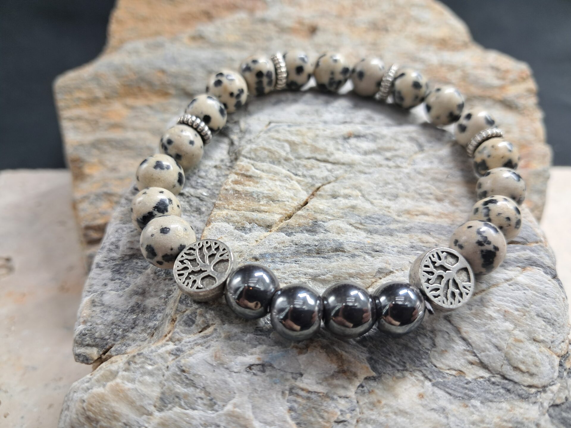 Bracelet jaspe dalmatien et hématite perles 8mm