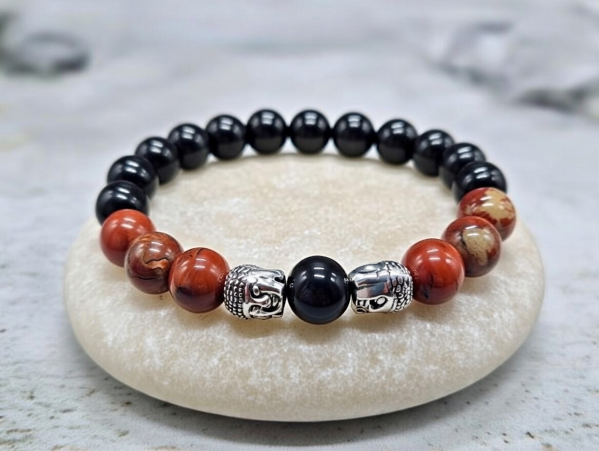 Bracelet jaspe rouge, obsidienne noire, hématite 10mm