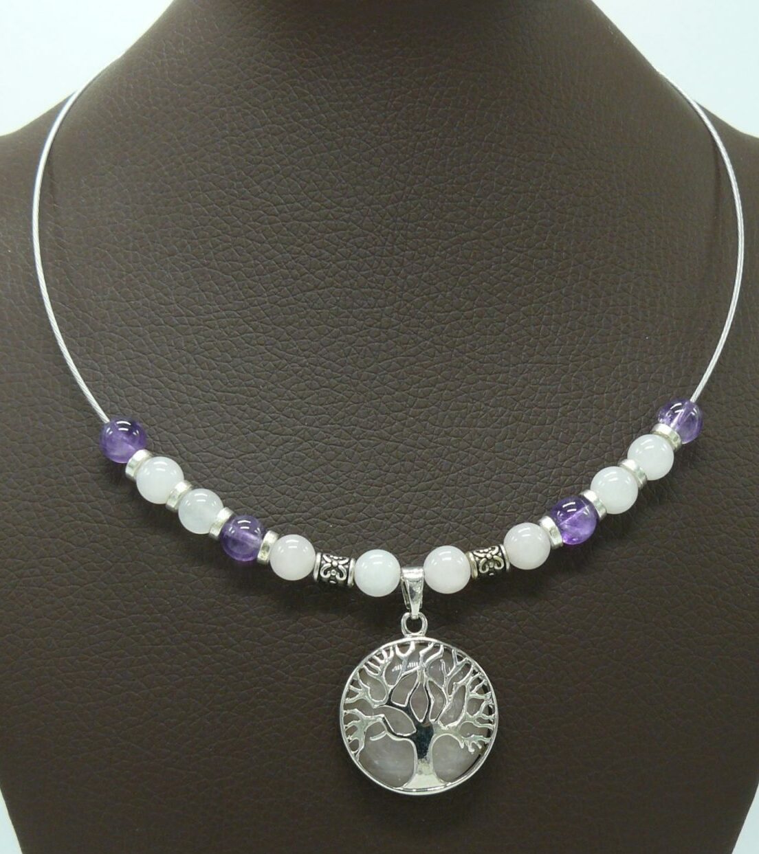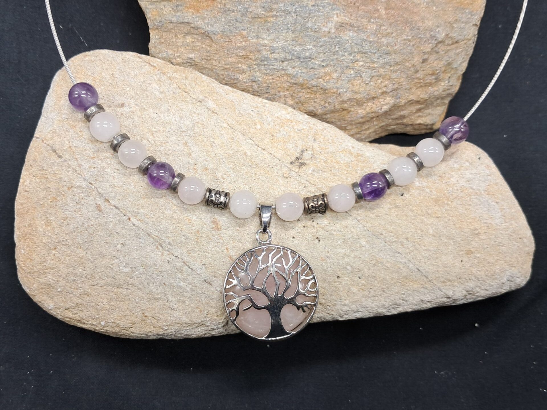 Collier arbre de vie quartz rose-perles améthyste et quartz rose perles de 8mm